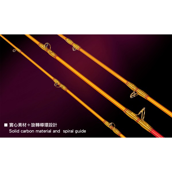 5 different carbon cloth combinations & covering the rod body outside the solid carbon, Tip is used 30T high carbon to increase its elasticity and simulate the rebound power of the hollow rod, making its blank stronger, tougher and lighter. Therefore, the design features include slimness, light weight, high elasticity, and variable action from 3:7 to 4:6, in addition to being able to prevent the rod from breaking and fish from escaping due to various bends and extreme angles.