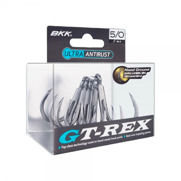 El anzuelo GT-REX utiliza la mejor tecnología de procesamiento de anzuelos BKK (Hand Ground) para garantizar su poder de perforación superior. El revestimiento ultracorrosivo patentado de BKK garantiza una nitidez y una penetración constantes. Utiliza la tecnología "Slim Ring" de BKK, que facilita la colocación de anillos sin sacrificar la fuerza.